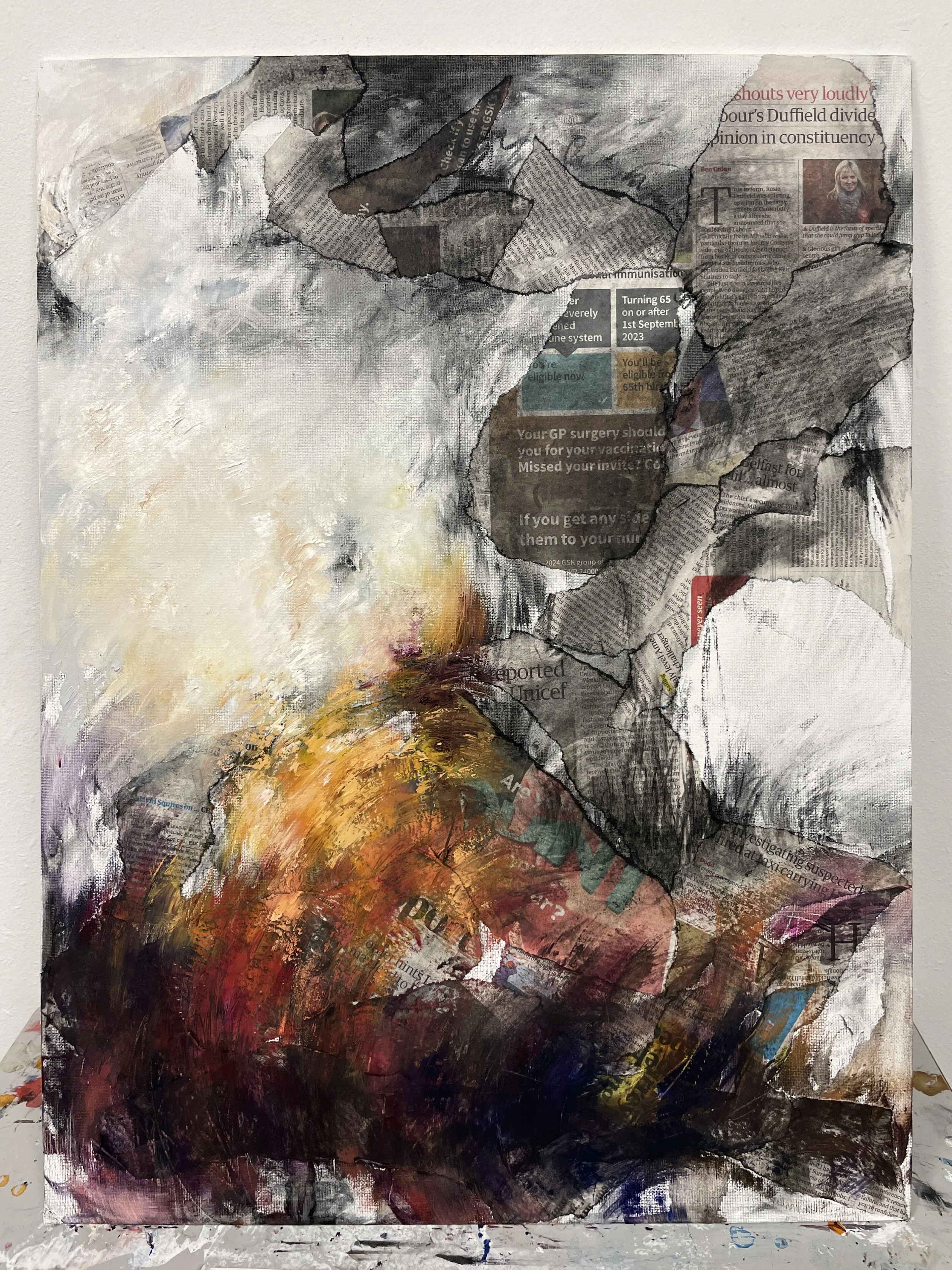 Yuhsuan Pai, Untitled I, 2024, oil, charcoal, and collage on canvas board, 45.7 × 61 cm.